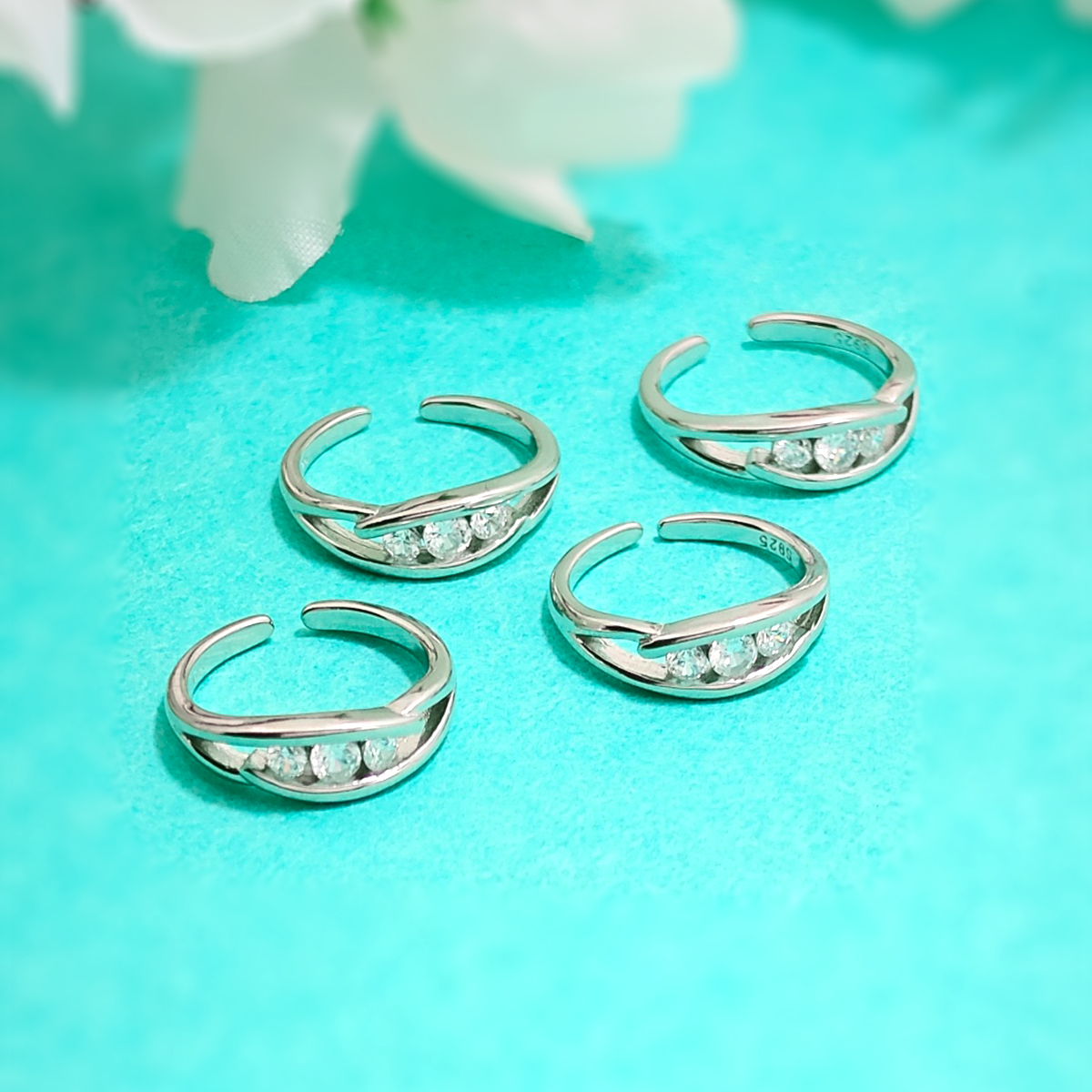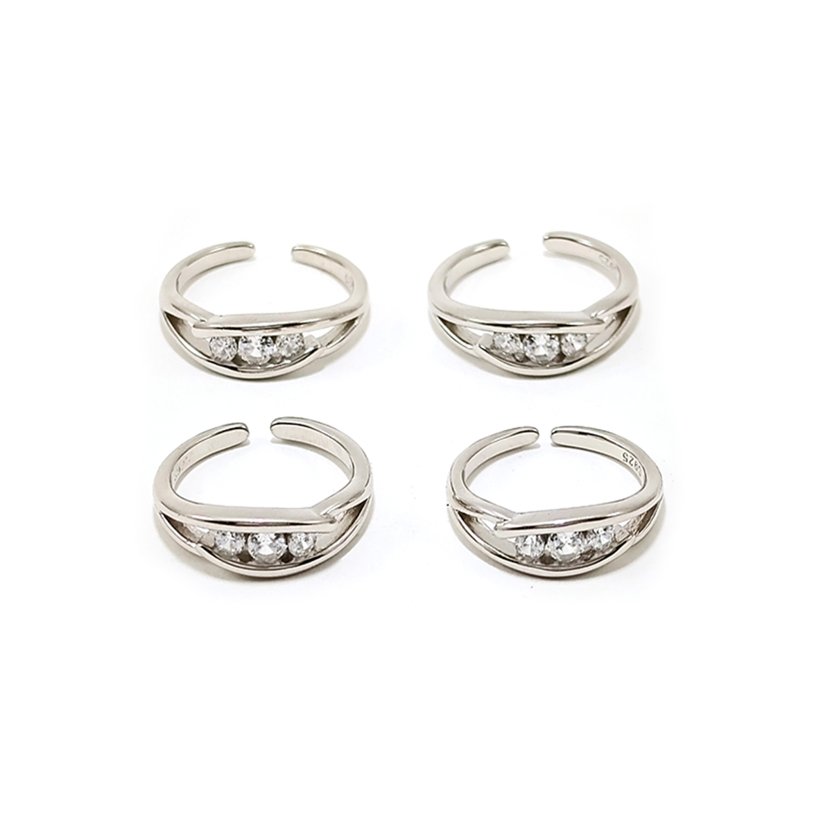 Description: Enhance your style with this exquisite set of four silver toe rings, each uniquely designed to add a touch of sparkle to your look. Crafted from high-quality silver and adorned with clear gemstones, these toe rings are perfect for any occasion. Their adjustable design ensures a comfortable fit for any toe size, making them a versatile addition to your jewelry collection.