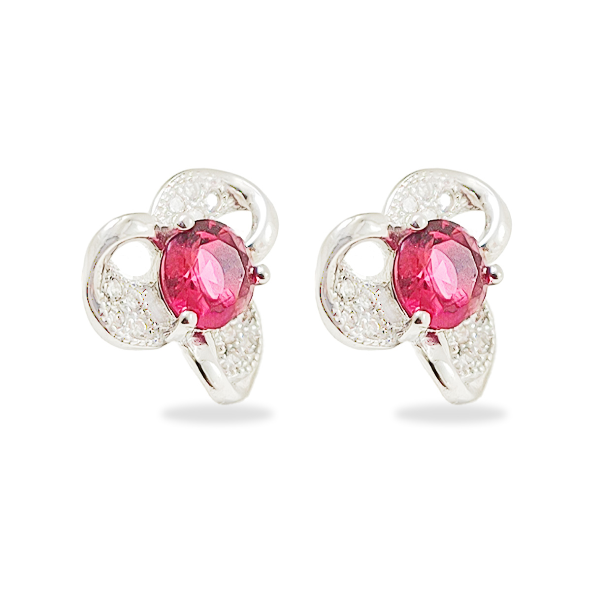 These exquisite earrings feature a central pink gemstone, elegantly surrounded by smaller clear gemstones, all set in a luxurious Sterling Silver. The floral design exudes a timeless elegance,
