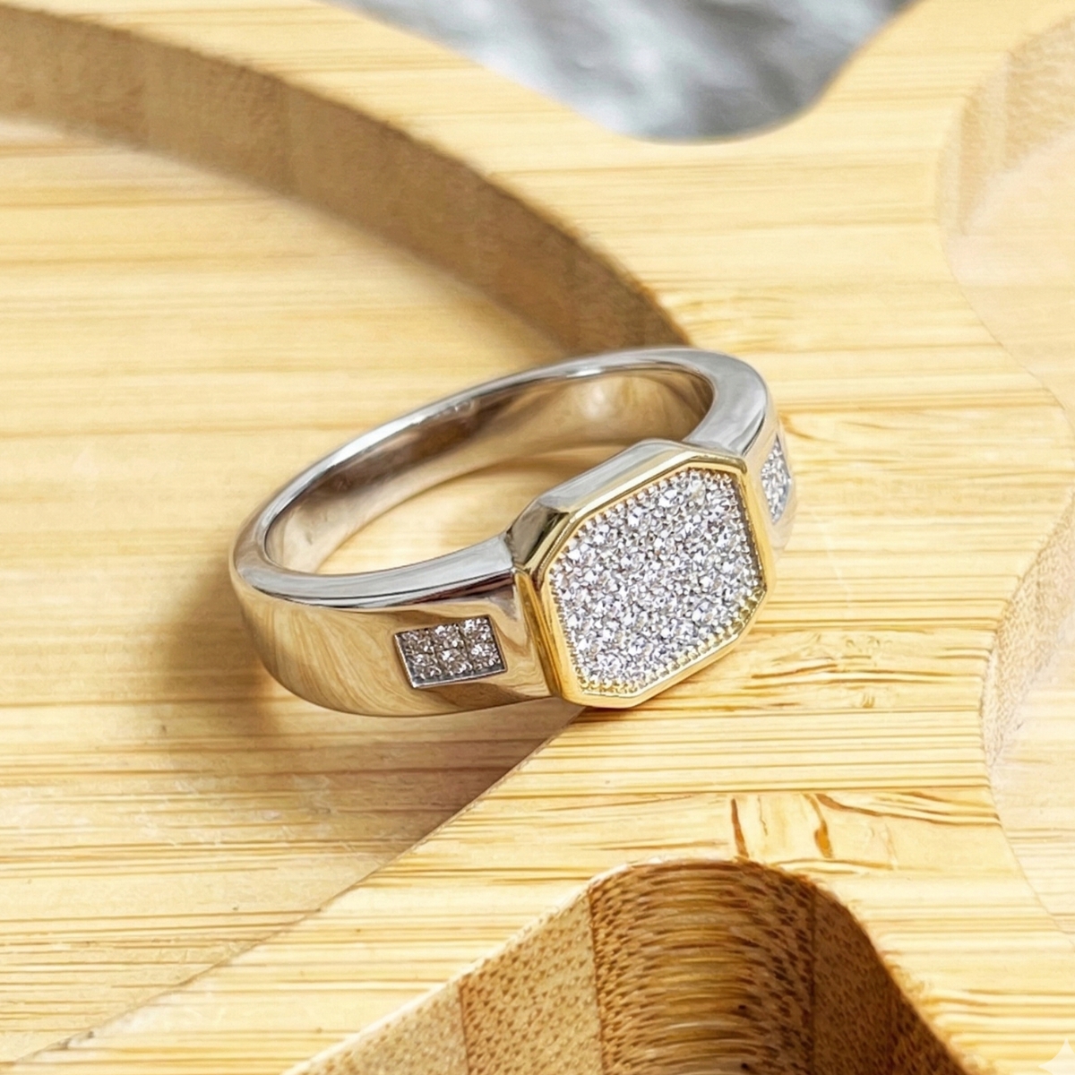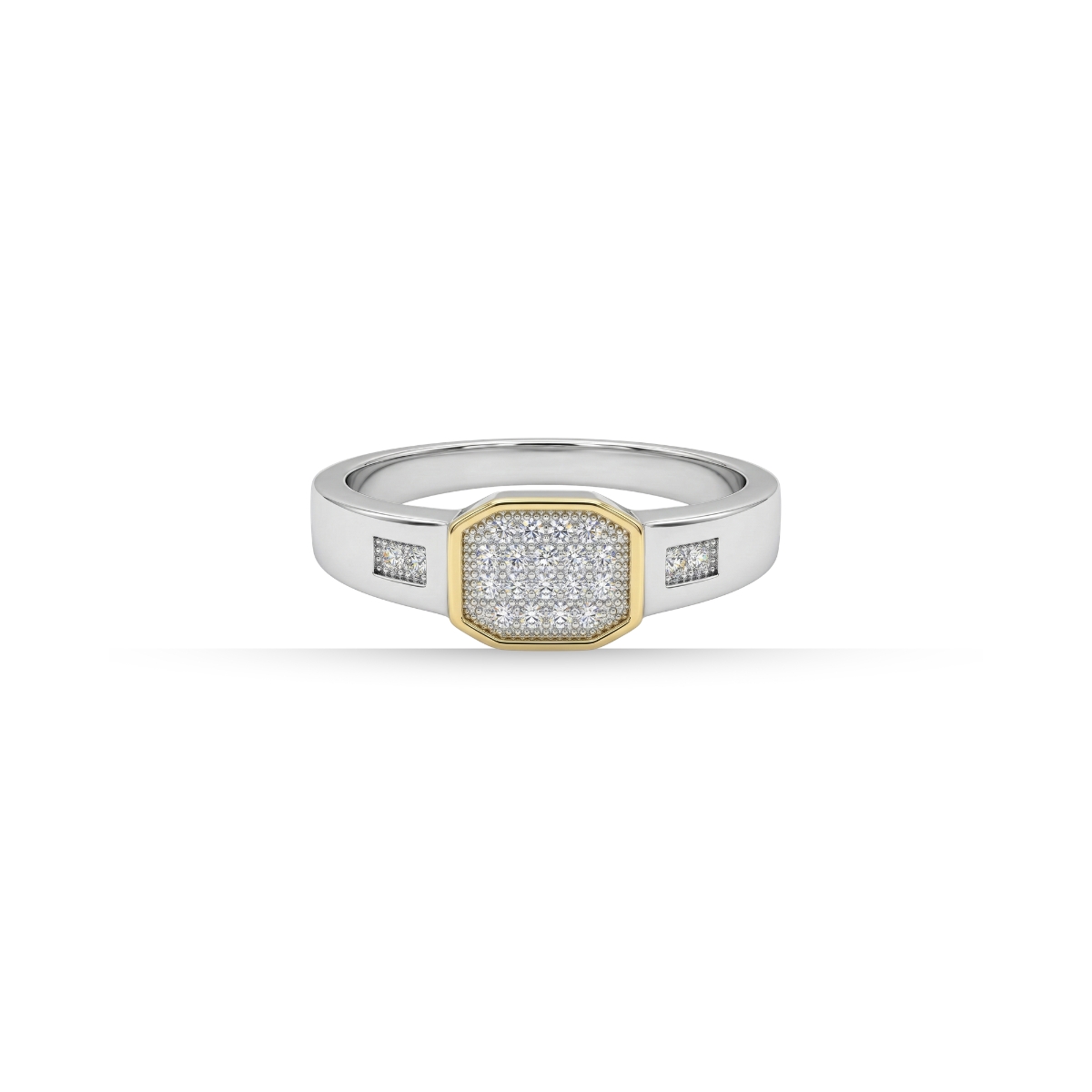 Crafted for the modern gentleman, this luxurious ring combines timeless sophistication with bold design. The band, made from premium white metal, is accented by a striking rectangular centerpiece encrusted with shimmering stone arranged in a refined grid pattern. A warm yellow-gold frame surrounds the stone, creating a captivating contrast that highlights the brilliance of the stones.