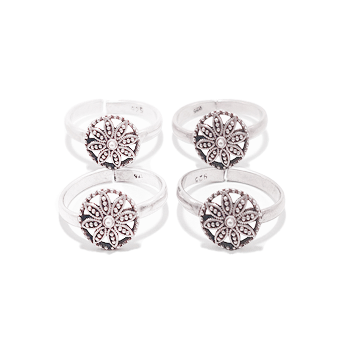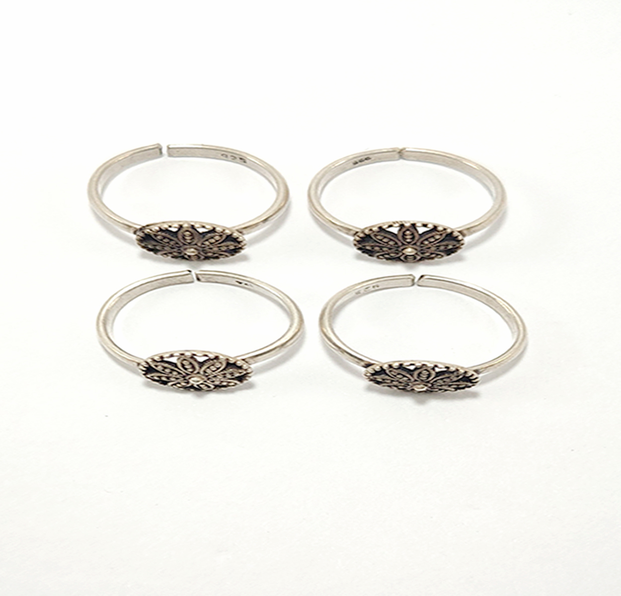 The image shows four identical silver a toe ring with intricate, symmetrical patterns on their faces. They are arranged in a staggered line, showcasing the detailed design work that makes them unique and visually appealing. The plain white background emphasizes the elegance and craftsmanship of the a toe ring.
