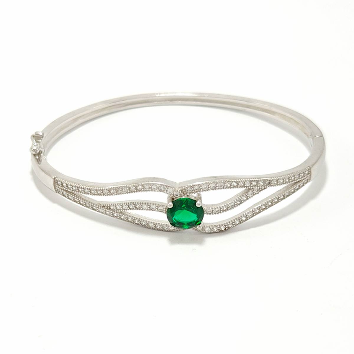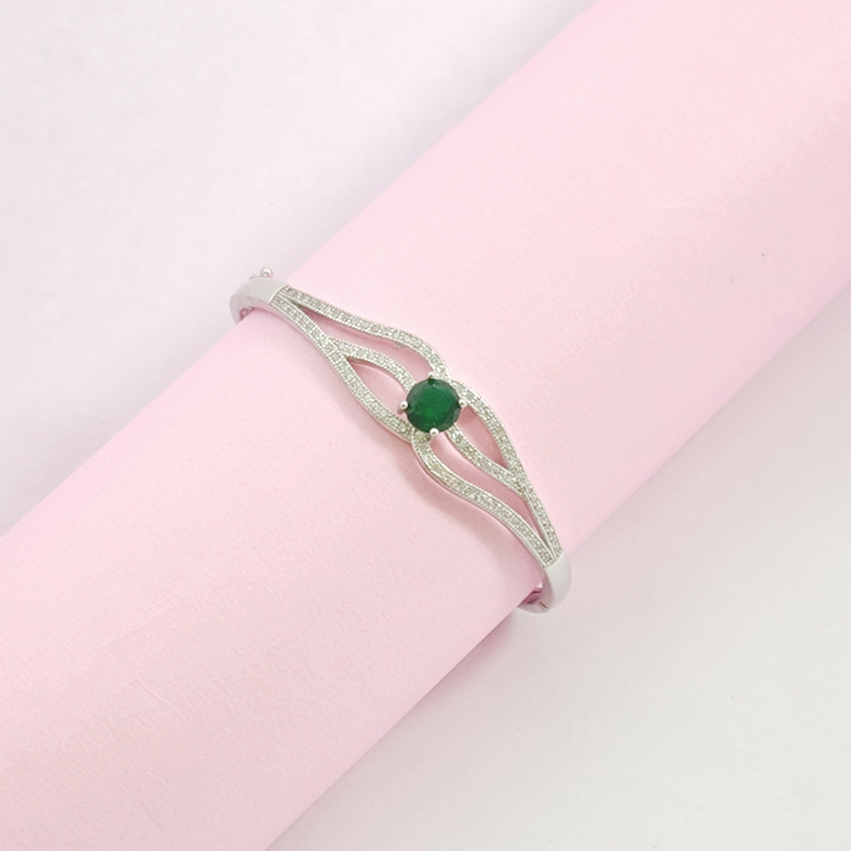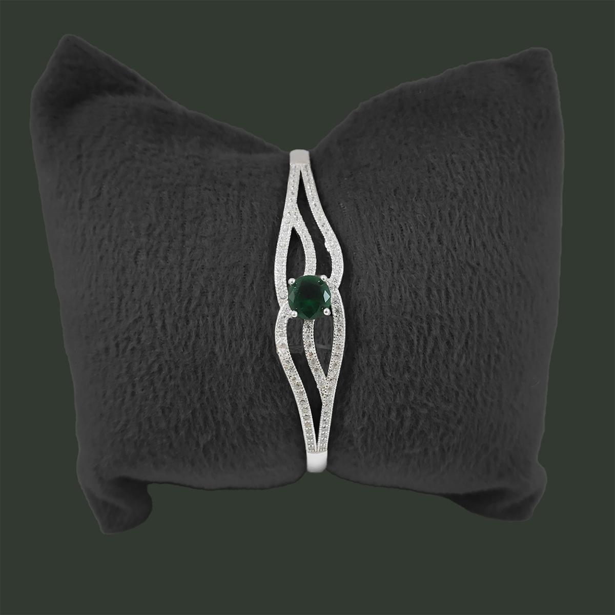 A silver bracelet with a delicate, curved design. It features small clear gemstones and a prominent green gemstone at its center. The contrast between the green stone and the silver setting makes it visually striking. The bracelet exudes elegance and sophistication.
