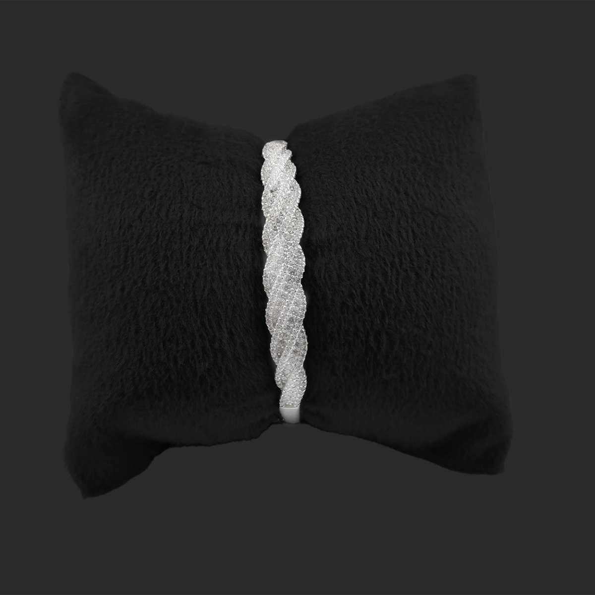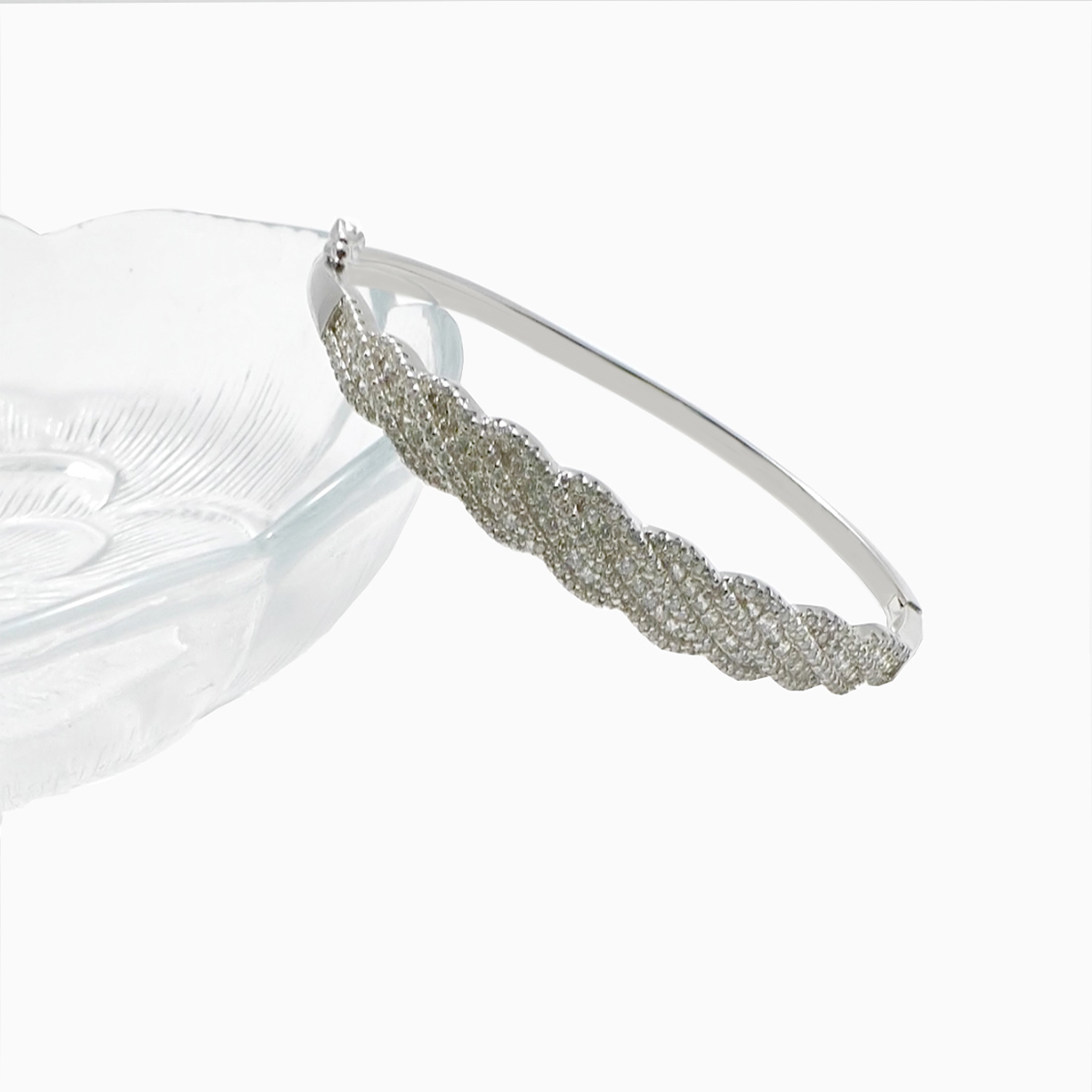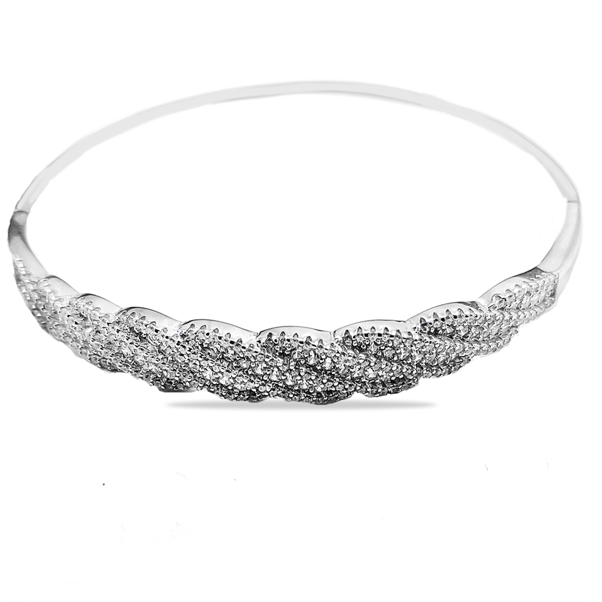 A silver-colored bracelet with a wave design, embellished with multiple small, clear gemstones that give it a sparkling appearance. The bracelet’s intricate pattern and shimmering stones make it an elegant piece of jewelry.