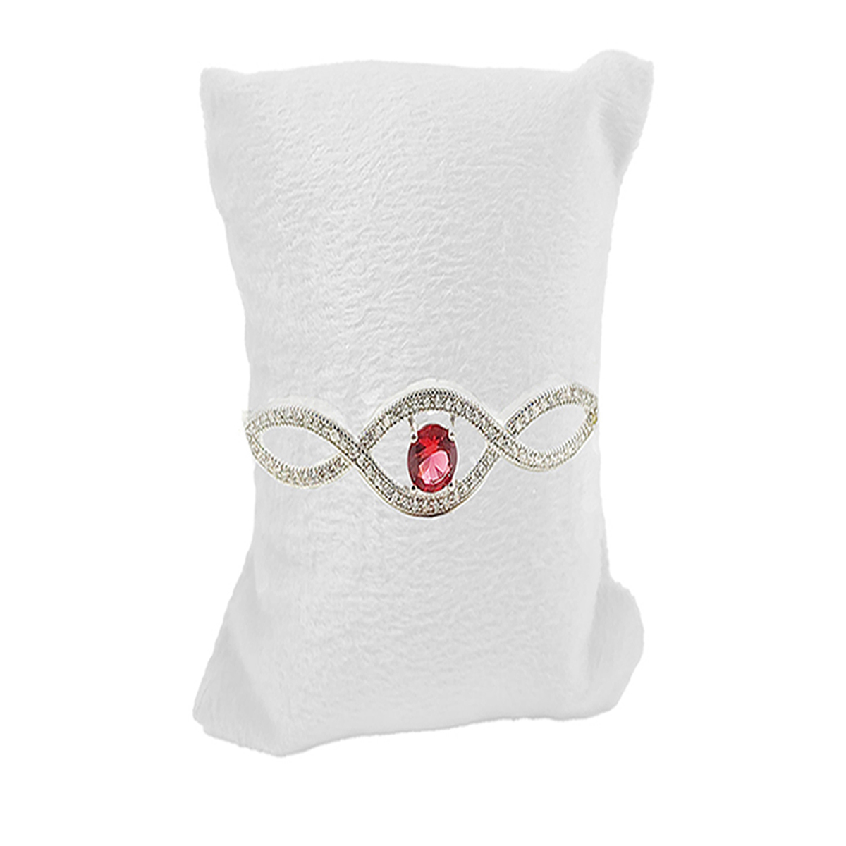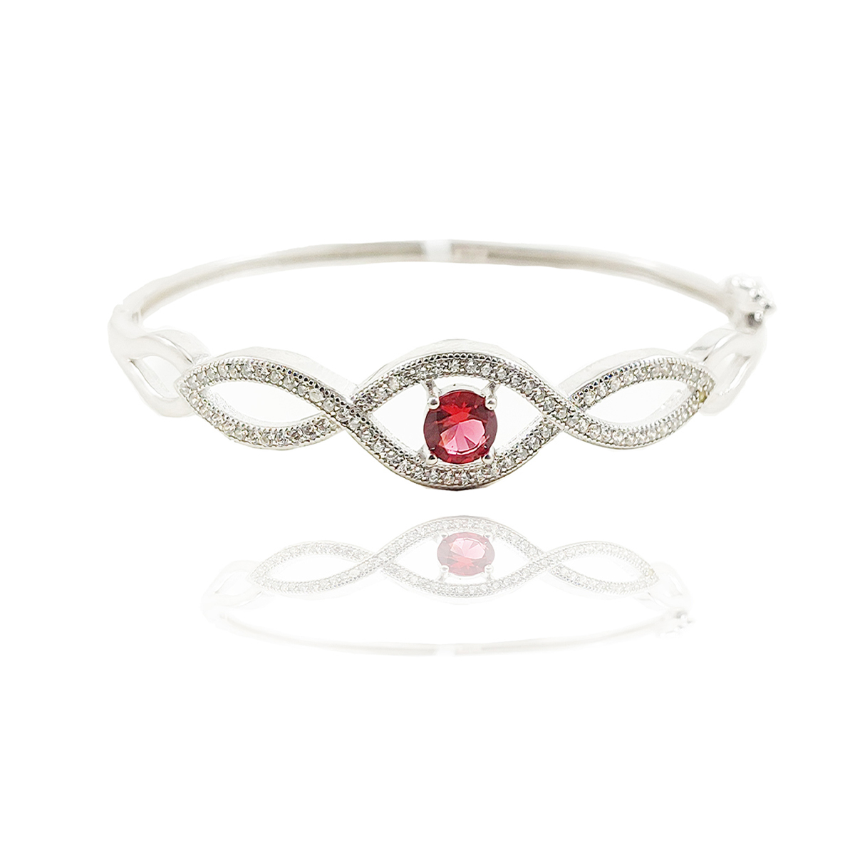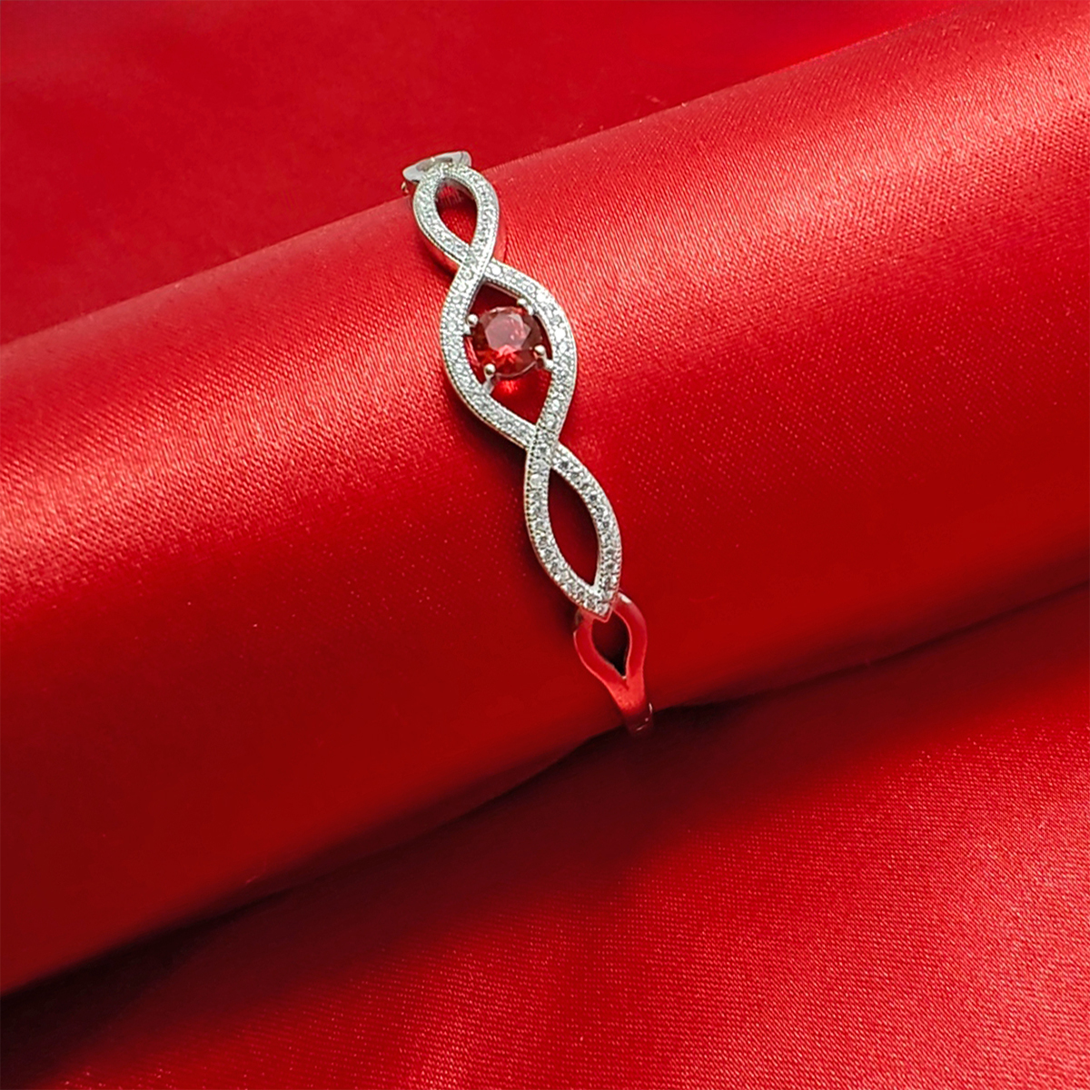 A silver-colored bracelet with an infinity symbol design, embellished with clear gemstones and featuring a central red gemstone. The intricate design and sparkling stones make it an elegant piece of jewelry.