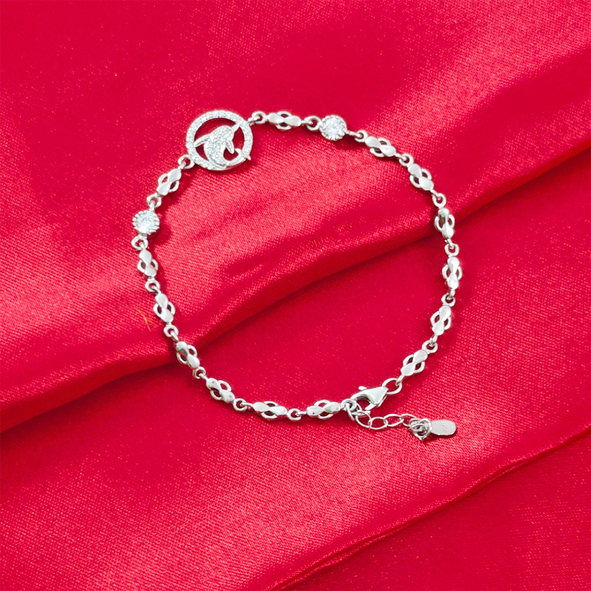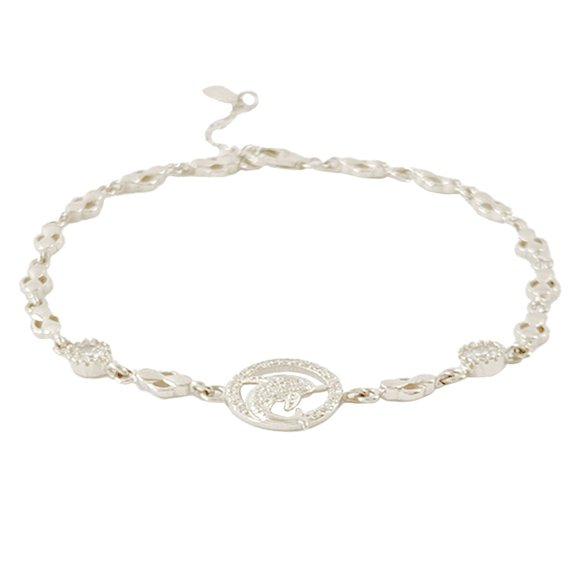 A silver bracelet with a circular charm featuring small, clear gemstones and a fish Shape Style. The bracelet has an adjustable chain closure, making it versatile for different wrist sizes. Its delicate design and sparkling details make it a charming accessory.