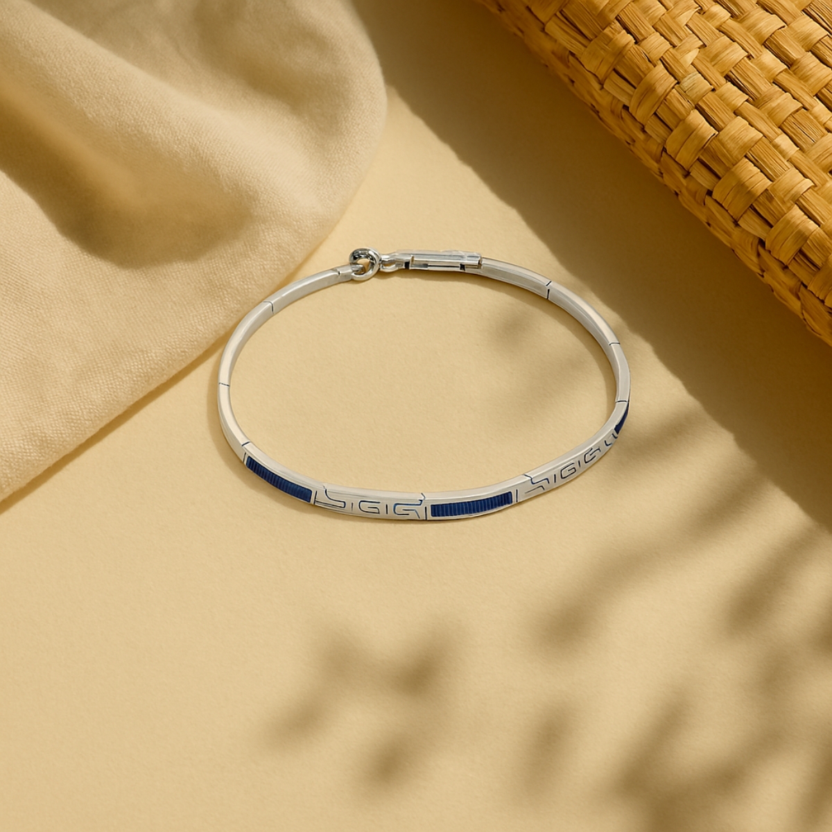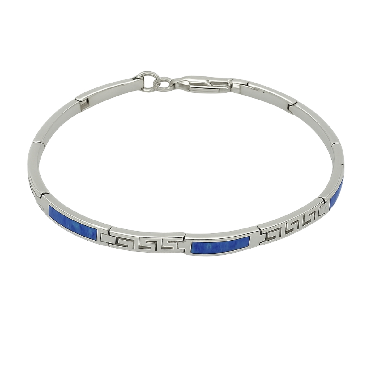 Description:- Precision meets poetry in the Blue Prism bracelet—a striking fusion of clean lines and vibrant color. Each rectangular blue inlay is framed by polished silver segments etched with minimalist geometric patterns, creating a rhythm of light and form across the wrist.