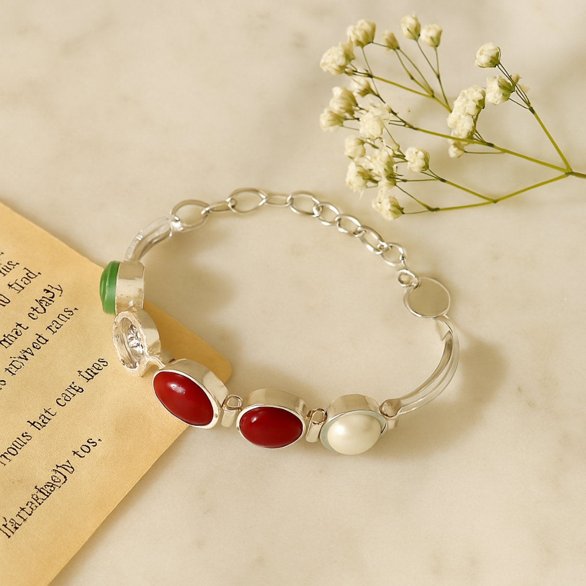 Description:- Crafted in 92.5 sterling silver, this bracelet features a radiant lineup of oval-cut gemstones—green, red, clear, and a luminous pearl—each symbolizing vitality, clarity, and serenity. The alternating colors create a harmonious rhythm, while the polished silver setting adds timeless sophistication.