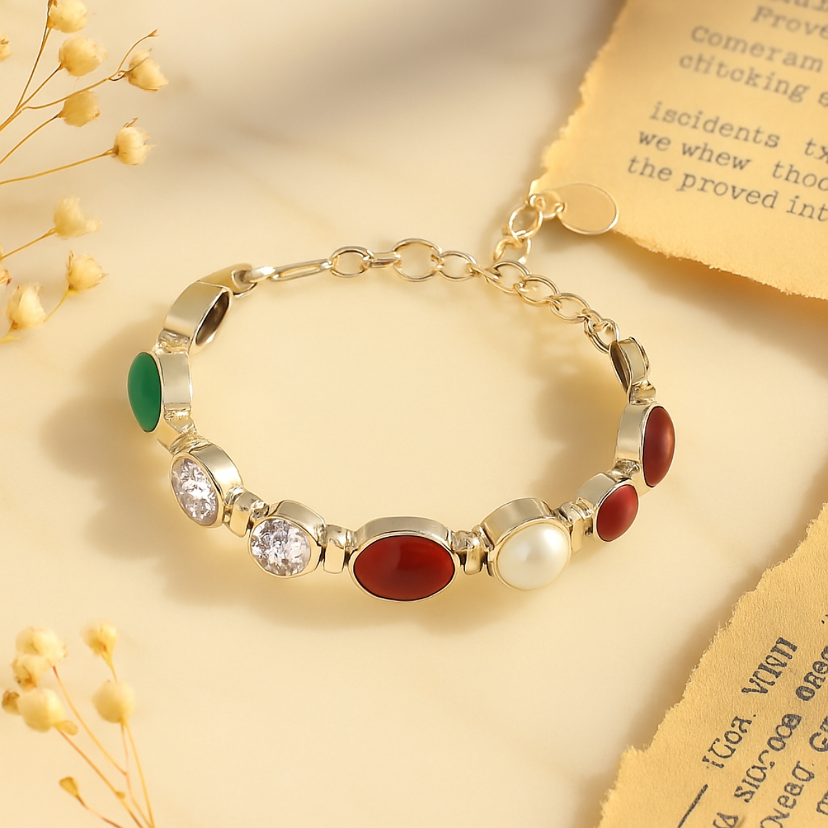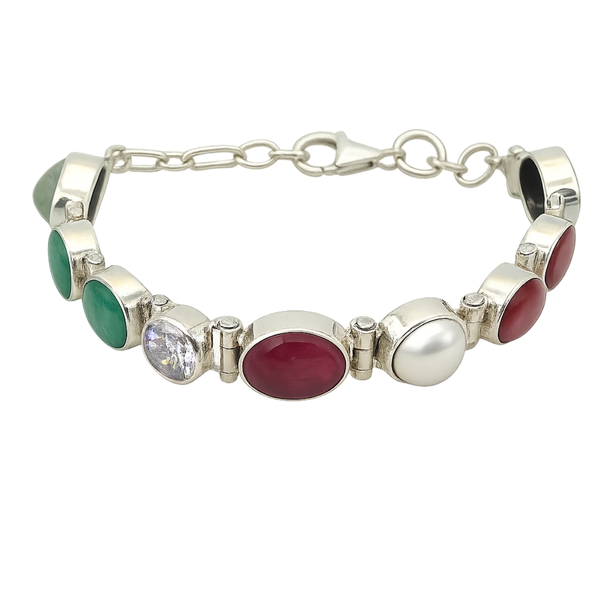 Description:- Crafted in 92.5 sterling silver, this bracelet features a radiant lineup of oval-cut gemstones—green, red, clear, and a luminous pearl—each symbolizing vitality, clarity, and serenity. The alternating colors create a harmonious rhythm, while the polished silver setting adds timeless sophistication.