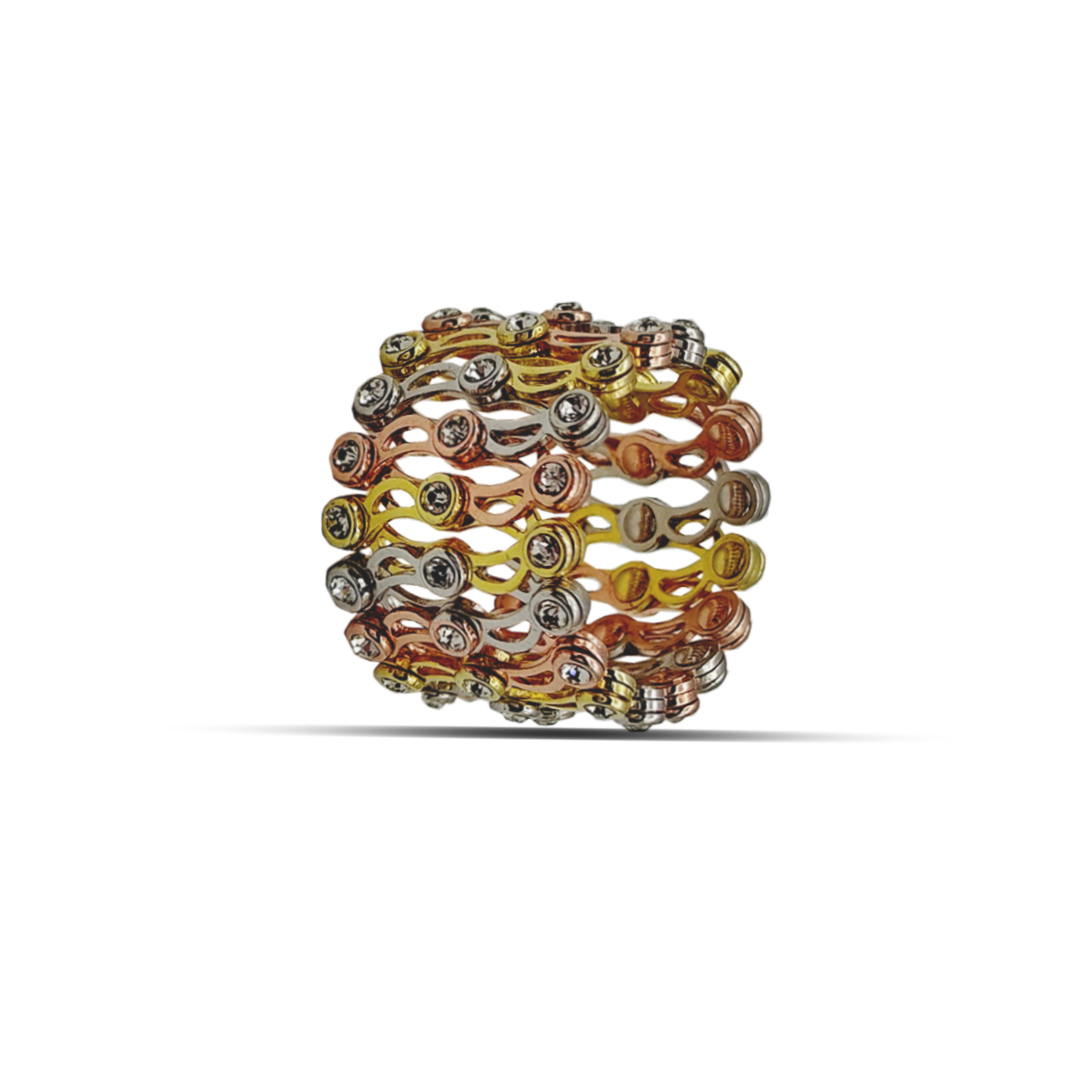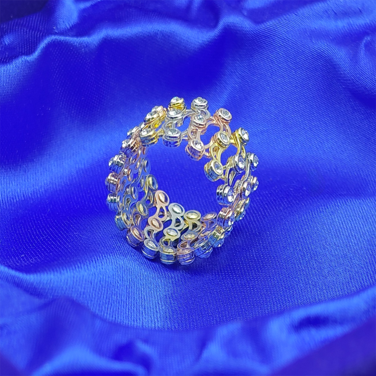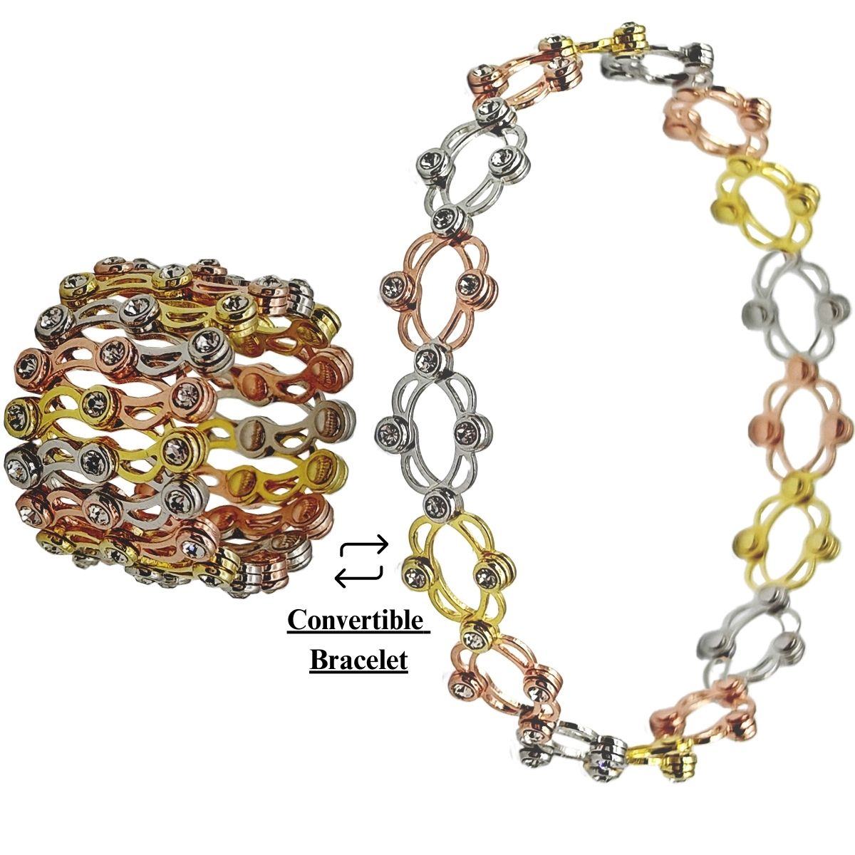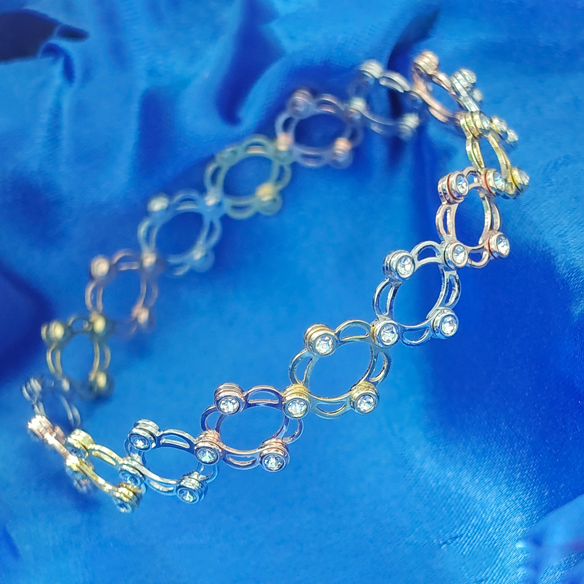 Description:- Introducing our stunning convertible bracelet, a masterpiece designed to suit your style. With its intricate interlocking loops and a trio of timeless metal tones—silver, gold, and rose gold this bracelet radiates sophistication. Adorned with shimmering gemstones, it adds just the right touch of sparkle.