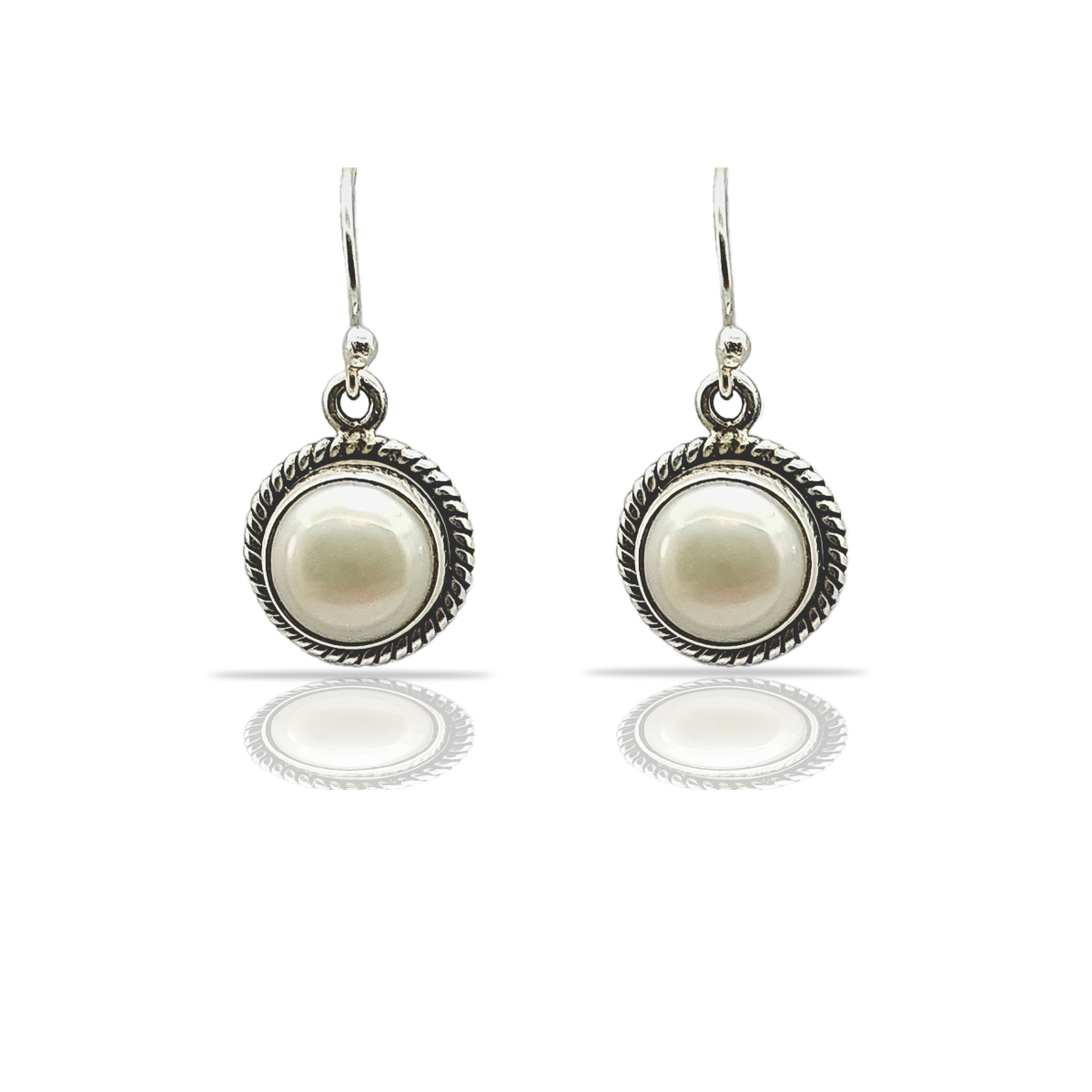 Pendant Set:- The centerpiece of this set, the pendant set, boasts a sleek silver chain, perfectly complementing the central white pearl nestled within an intricate circular silver setting. The delicate twisted rope detailing adds a touch of refinement, making it an ideal accessory for any occasion.