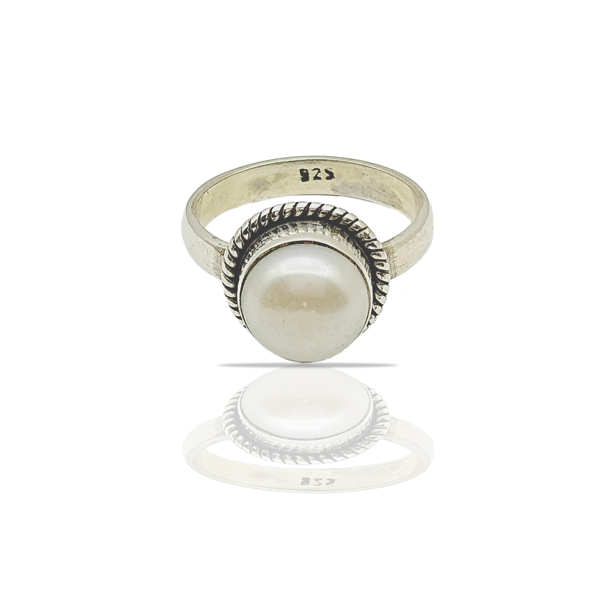 Ring:- Complete the look with the matching ring, marked with "925" to signify its sterling silver composition. The ring's central white pearl and ornate twisted rope detailing ensure it stands out as a statement piece.