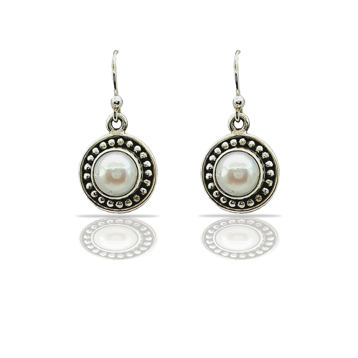 Pendant Set:- The centerpiece of this set, the necklace, boasts a sleek silver chain, perfectly complementing the central white pearl nestled within an intricate circular silver setting. The delicate beaded detailing adds a touch of refinement, making it an ideal accessory for any occasion.