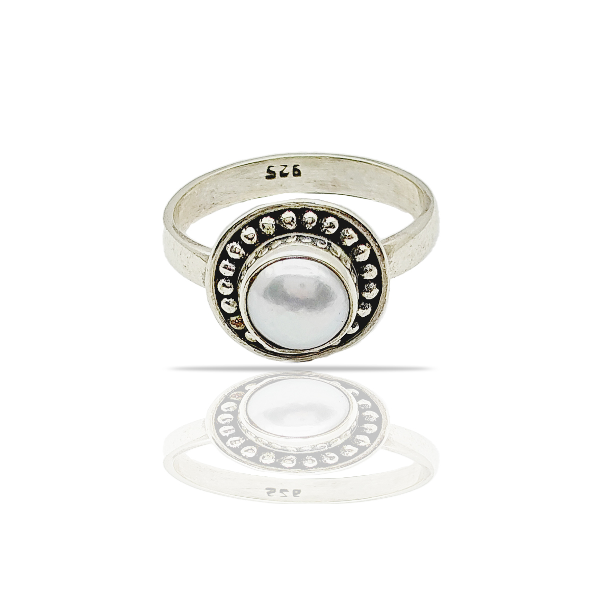 Ring:- Complete the look with the matching ring, marked with "925" to signify its sterling silver composition. The ring's central white pearl and ornate beaded detailing ensure it stands out as a statement piece.