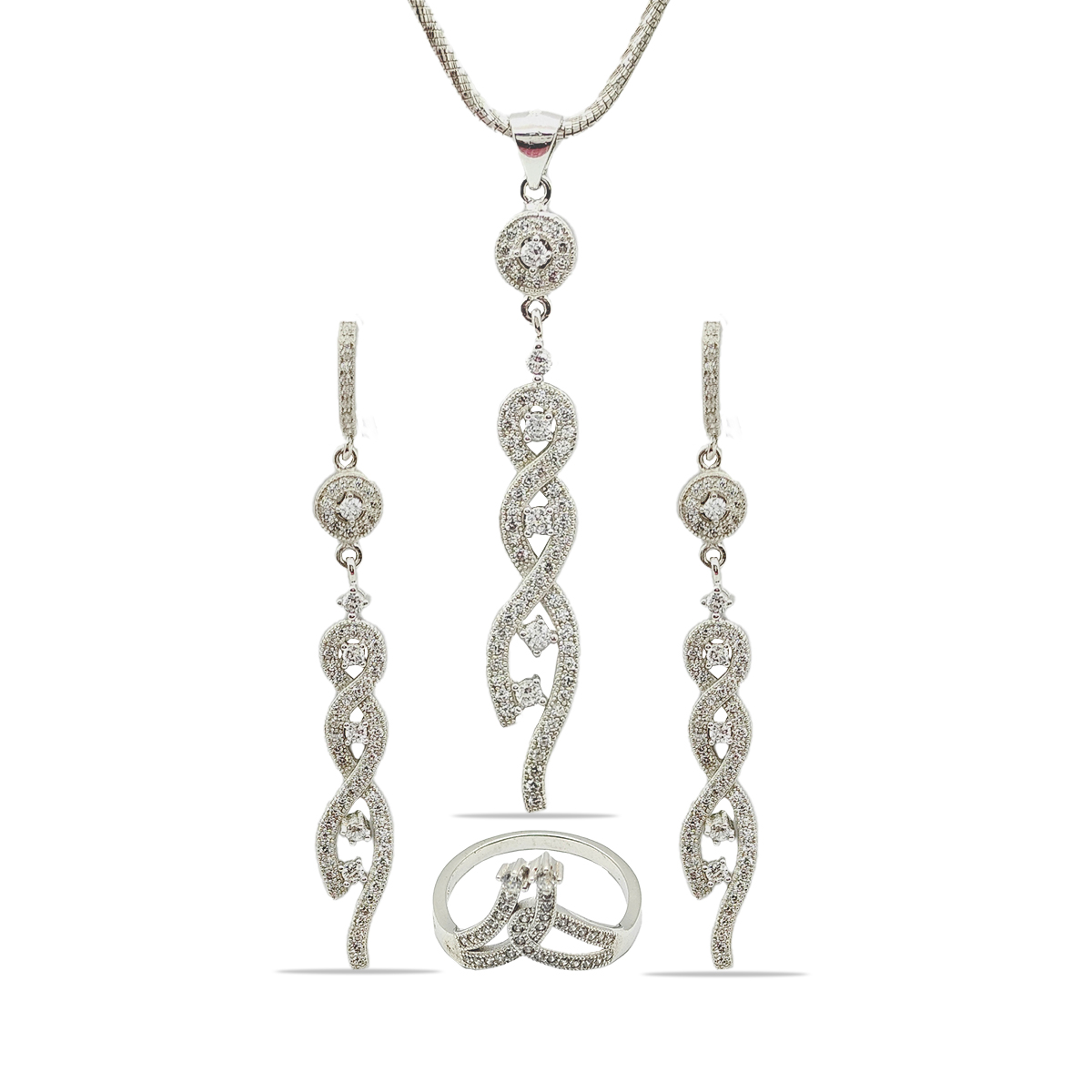 Description:- Elevate your elegance with our glamorous silver twisted pendant set, designed to add a touch of sophistication and sparkle to any ensemble. This beautifully crafted set includes a pendant set, matching earrings, and a complementary ring, all featuring intricate, intertwined patterns adorned with shimmering stones.