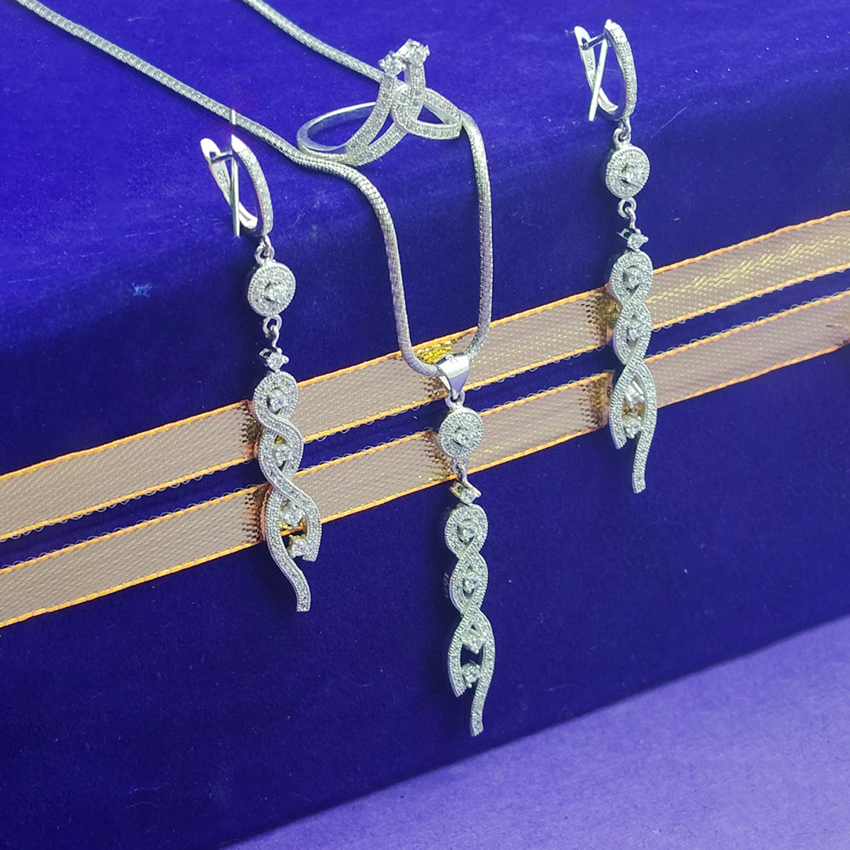 Ring:- Complete the ensemble with the matching ring, featuring a similar intertwined design. The ring's sparkling stones ensure it stands out as a statement piece, adding elegance to any outfit.