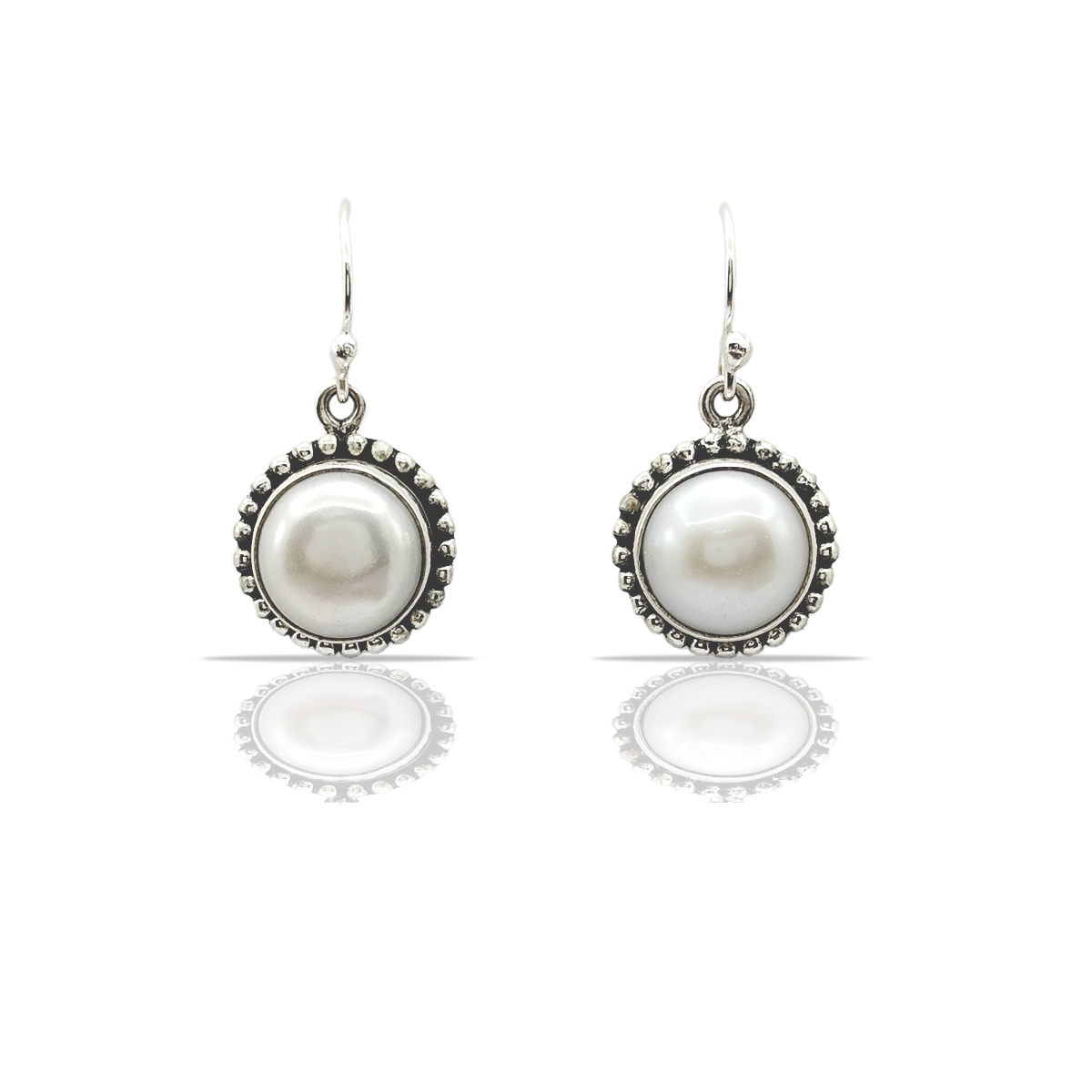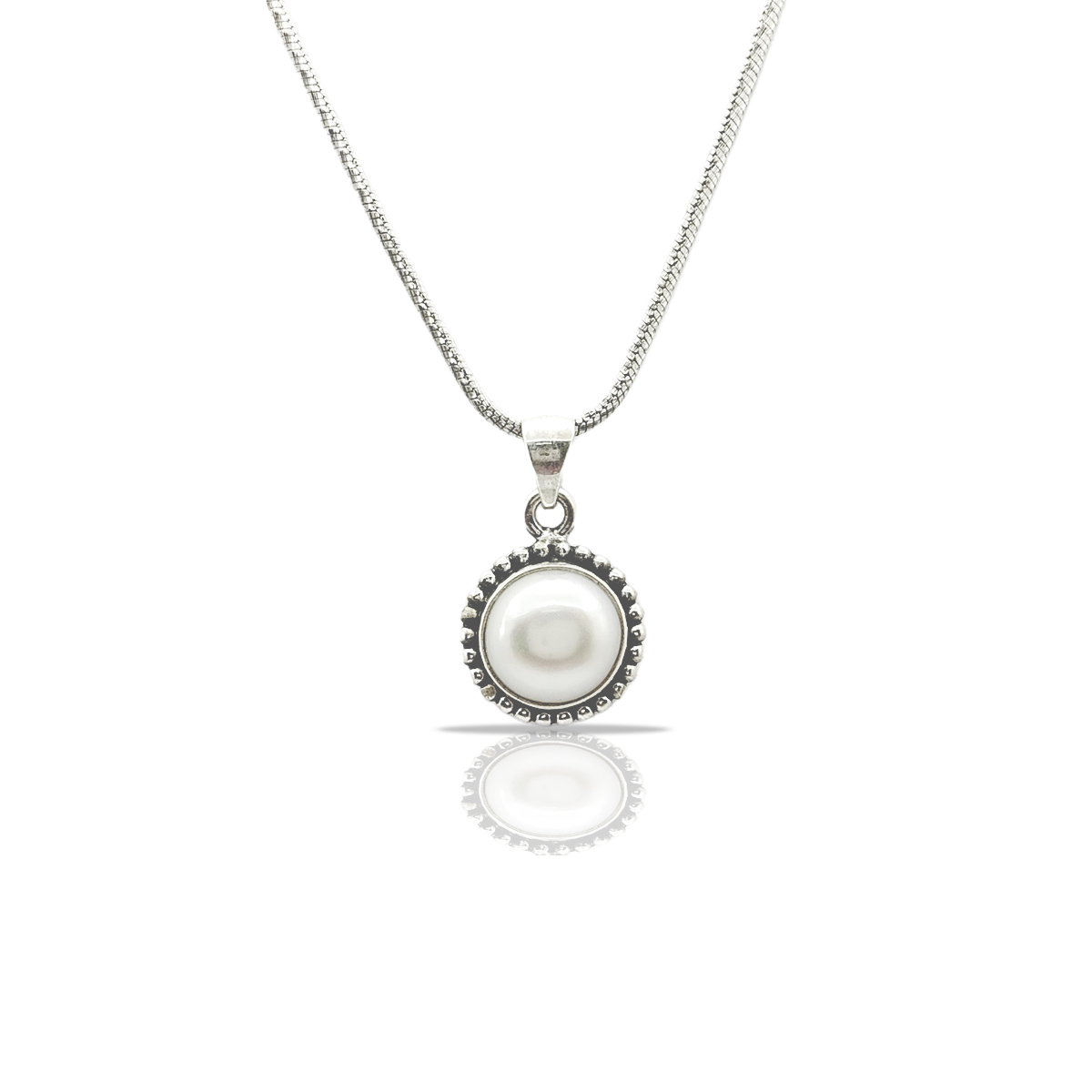 Pendant:- Showcases a large, round white pearl encased in an intricate silver setting with beaded detailing.