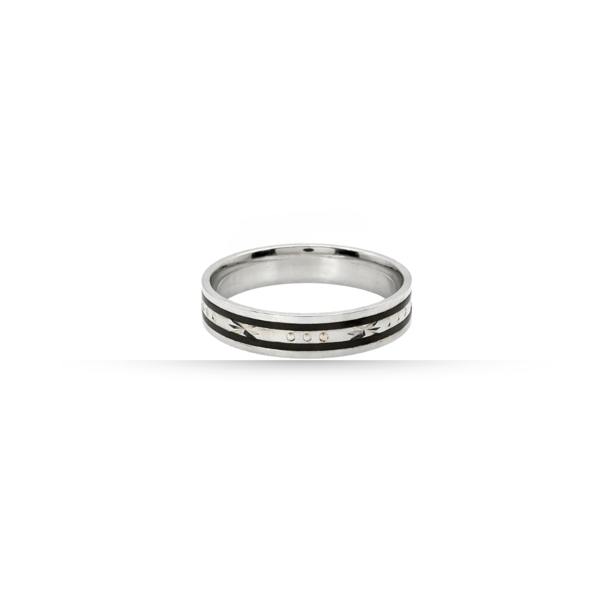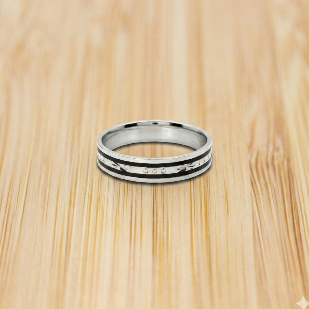 Elevate your style with this premium ladies gents common silver ring, crafted with precision and sophistication. The polished silver finish beautifully frames a striking black central band, adorned with intricate engravings of circular motifs and arrow-like patterns. Its symmetrical design reflects strength, balance, and modern masculinity, making it the perfect accessory for both casual wear and formal occasions