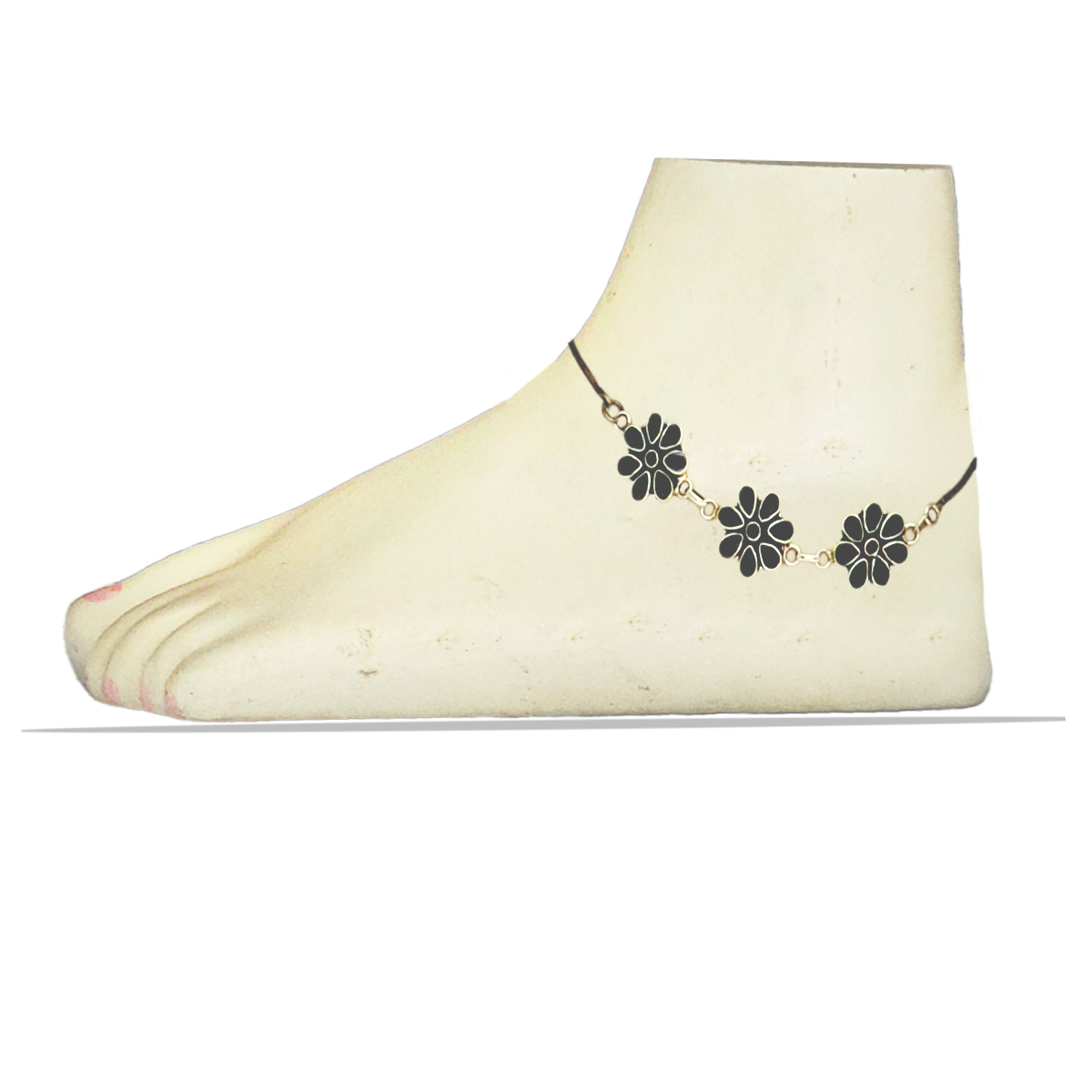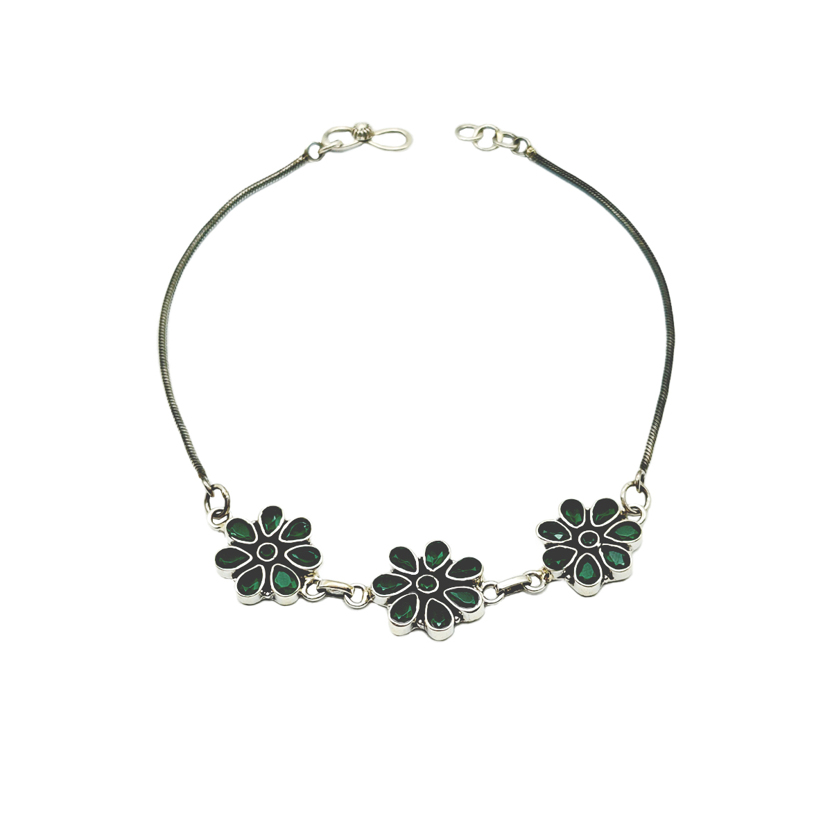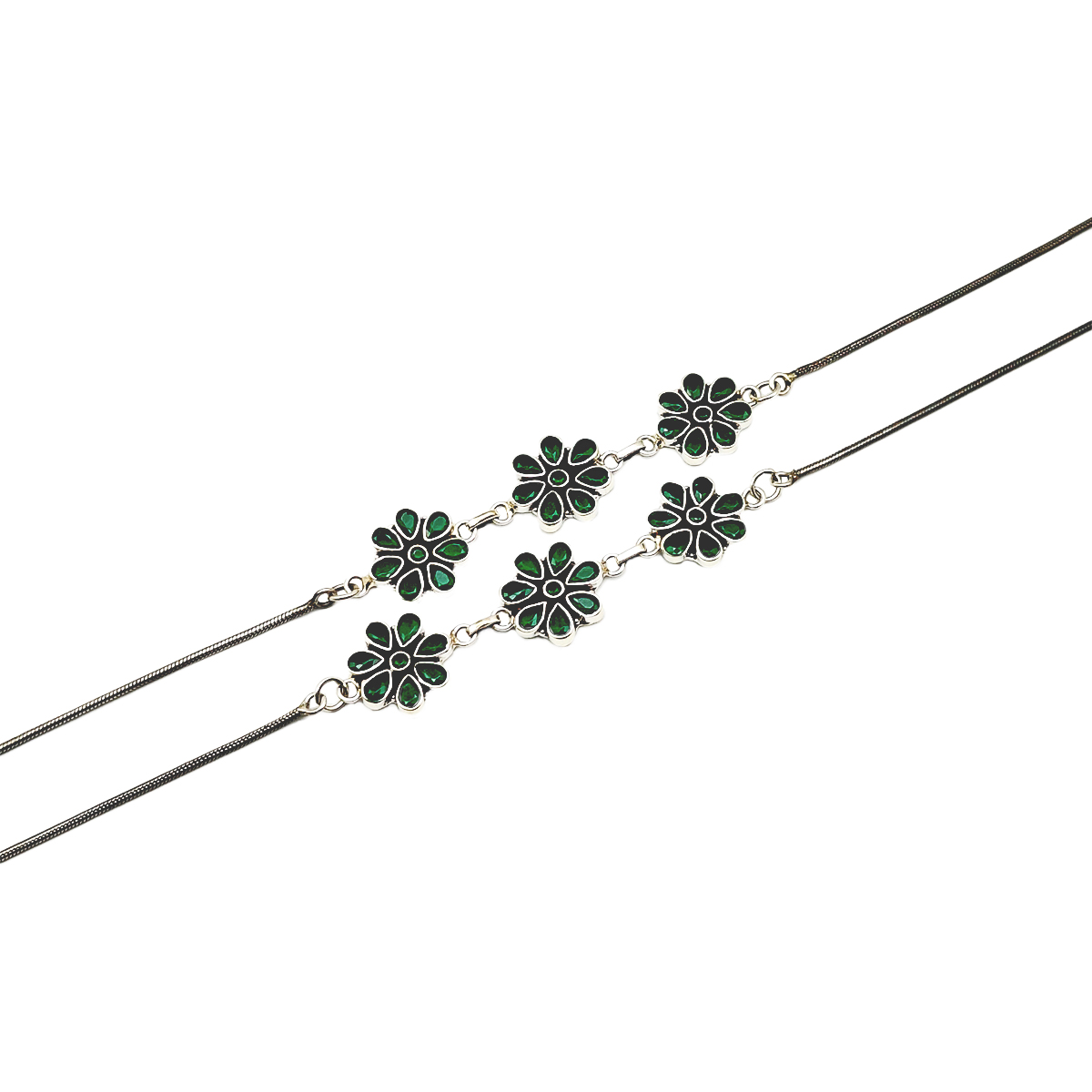 Description:- Elevate your style with this exquisite silver anklet adorned with three meticulously handcrafted flower-shaped charms. Each charm features dark green enamel petals that add a vibrant and refreshing touch, reminiscent of the beauty of nature. Designed with a sleek, flexible chain and a secure clasp, this anklet ensures both elegance and functionality.