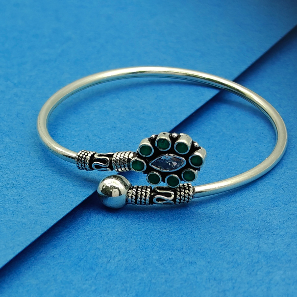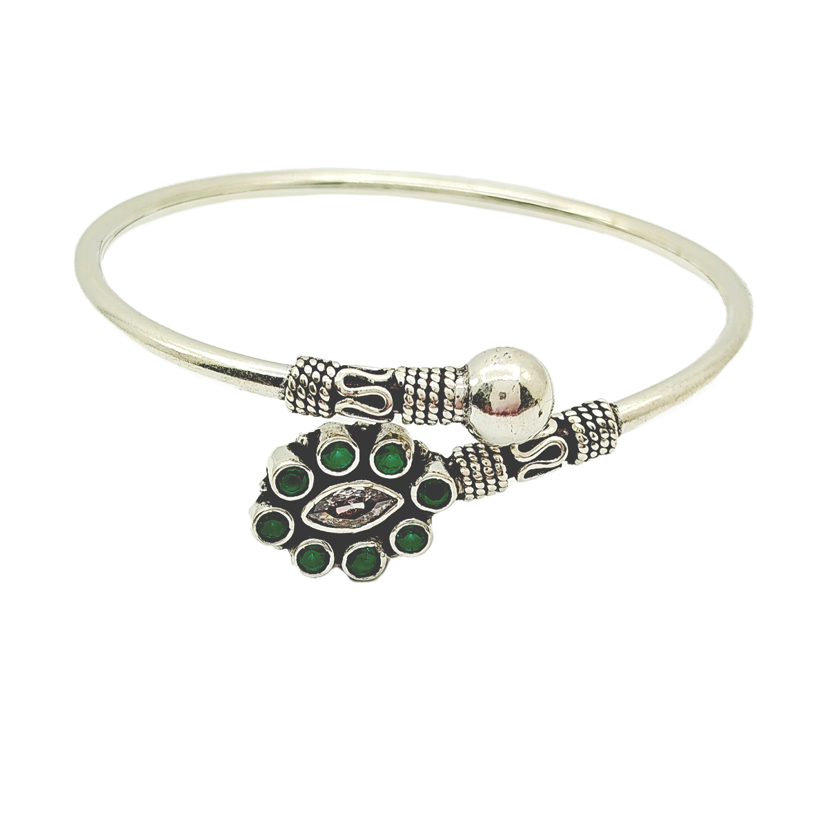 Description:- Elevate your jewelry collection with this exquisitely designed silver bracelet, a true work of art. Showcasing intricate silverwork, the bracelet features a captivating central element adorned with lush green stones and a marquise-shaped stone as its focal point. The ornate detailing, complemented by a spherical silver bead and delicate patterns, highlights the bracelet's elegance and traditional charm.