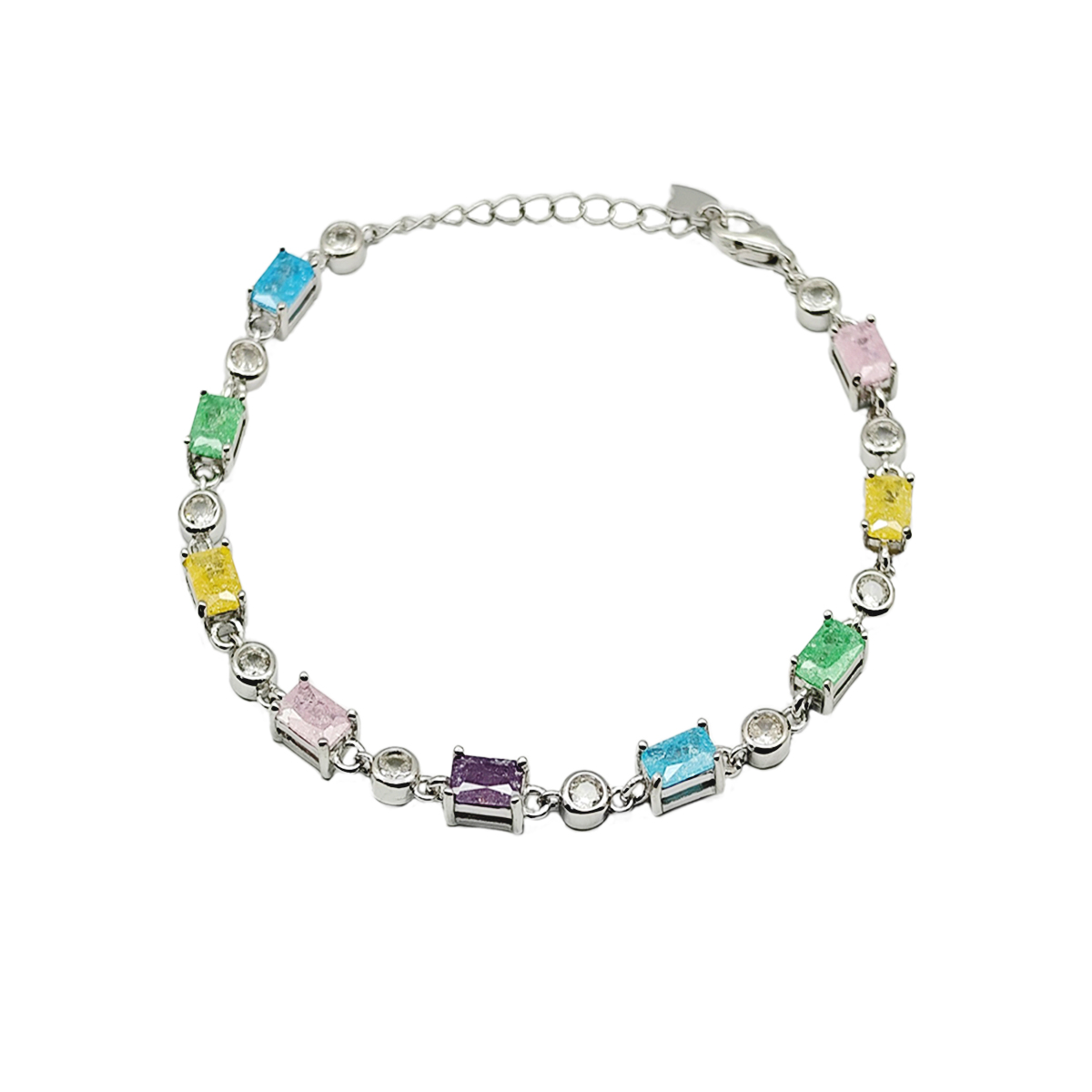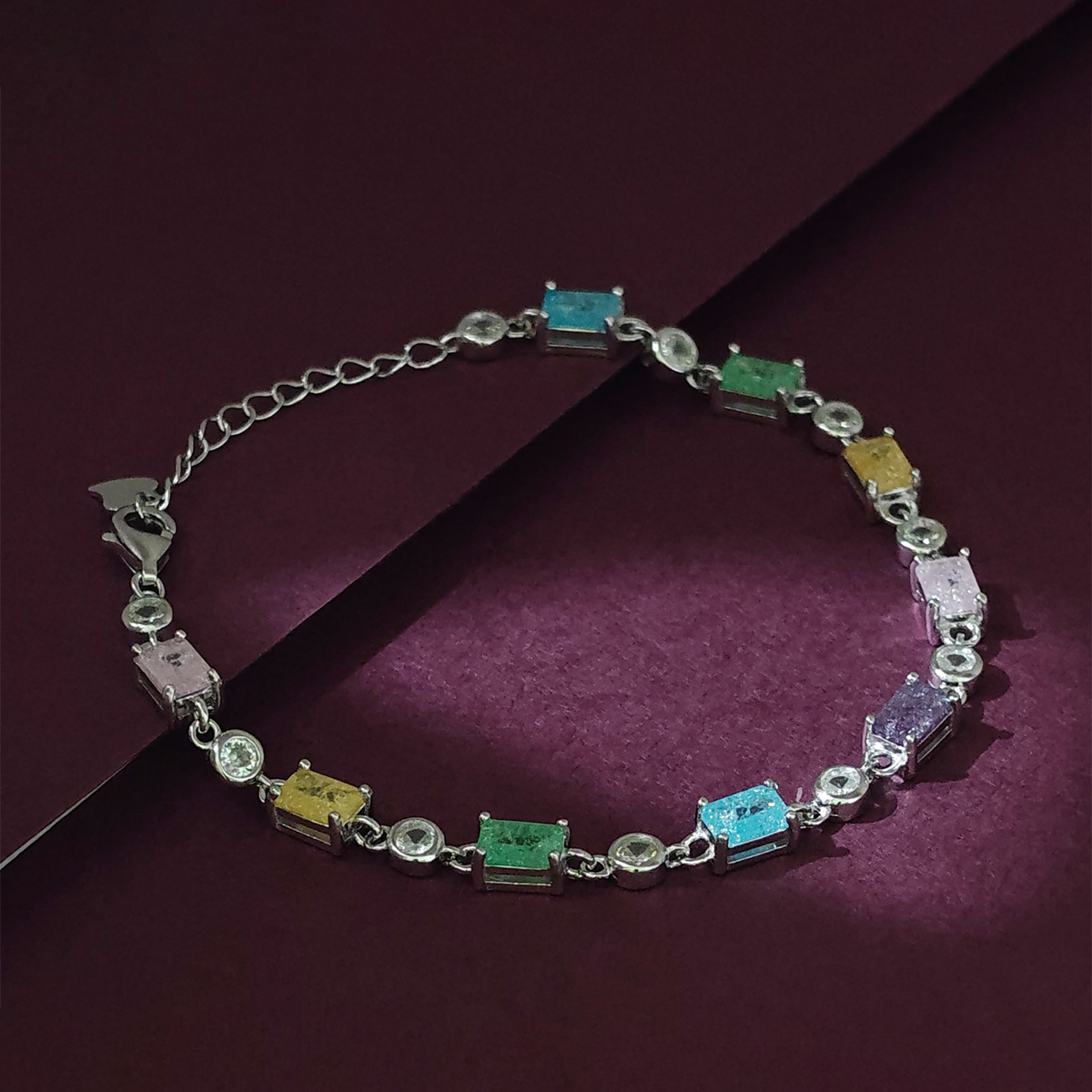 Description:- Step into a world of vibrant elegance with the SpectraGlow bracelet—a stunning blend of color, sophistication, and timeless silver craftsmanship. This exquisite piece features eight vivid rectangular gemstones in mesmerizing hues of pink, yellow, green, blue, and purple. Each gemstone is nestled in a sleek silver frame, accented by delicate clear stones that enhance the bracelet's brilliance.