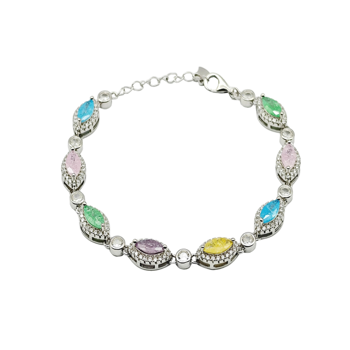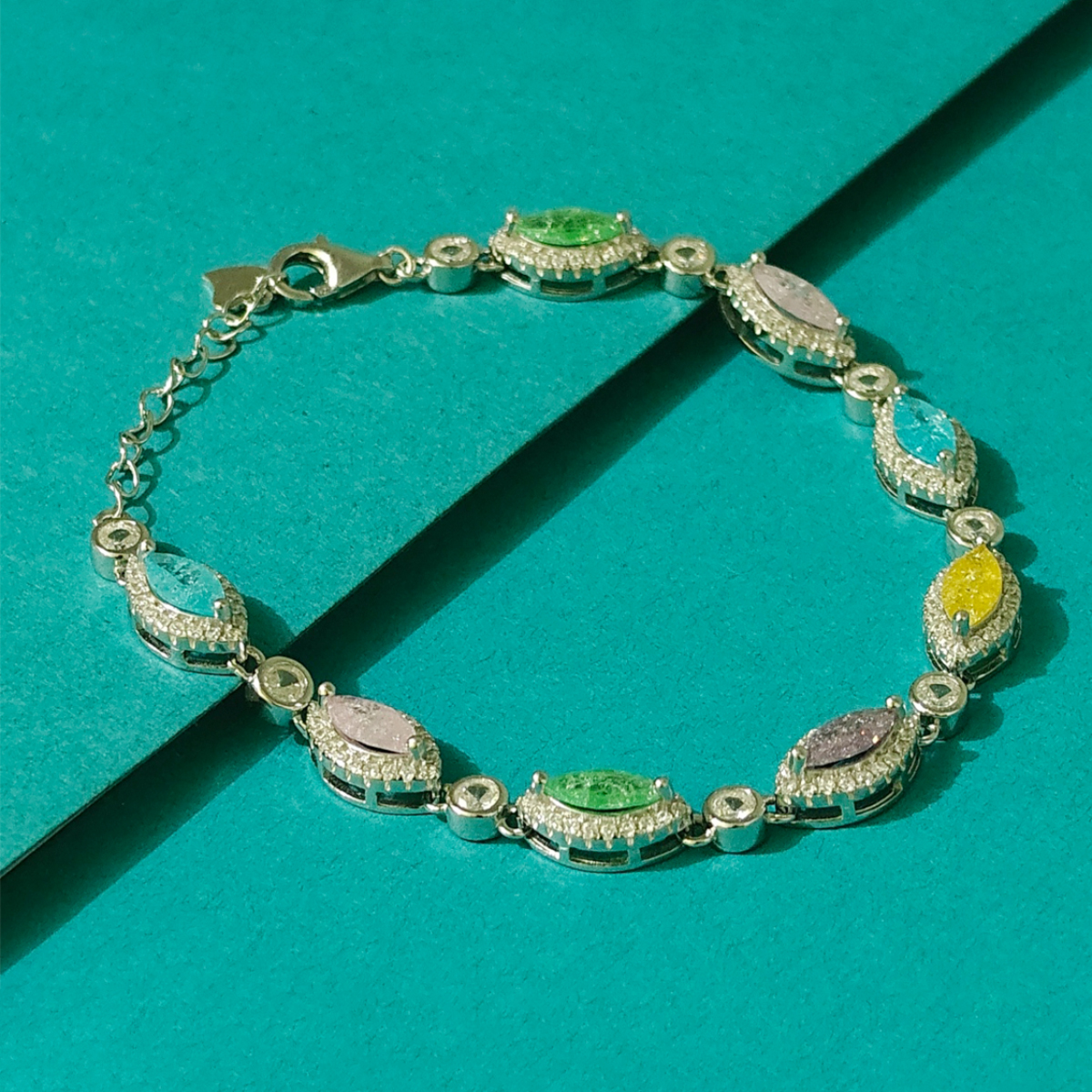 Description:- Dazzle your senses with this breathtaking multicolored silver bracelet, a masterpiece crafted for those who love vibrant sophistication. This bracelet showcases an exquisite array of marquise-cut gemstones in stunning hues of blue, pink, green, purple, and yellow. Each colorful gem is beautifully framed by sparkling clear stones, creating a radiant halo effect that adds unmatched brilliance to the design.